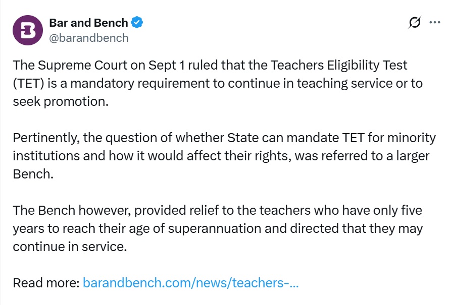 This decision has been taken after the Supreme Court order which said that teachers will have to pass TET within two years to keep their jobs and remain eligible for promotion. Only those teachers who have less than 5 years left for retirement will not have to pass TET.