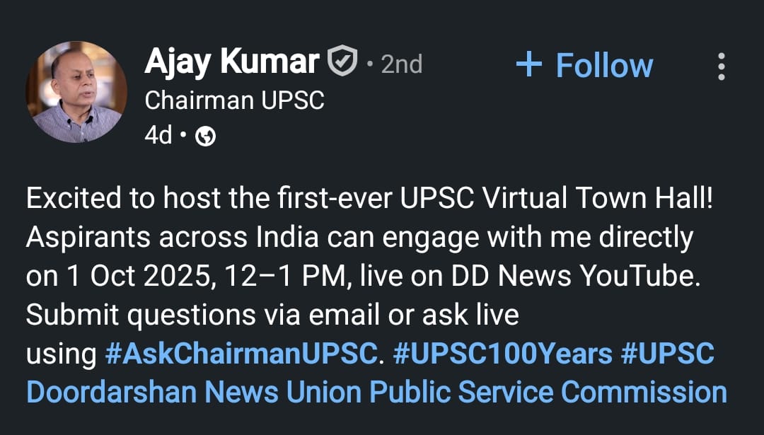 In the Linkdin Post, Ajay Kumar said, ‘For the first time I am excited about organizing UPSC Town Hall. Aspires across the country can connect with me directly from 12 to 1 pm on the YouTube channel of DD News on 1 October.