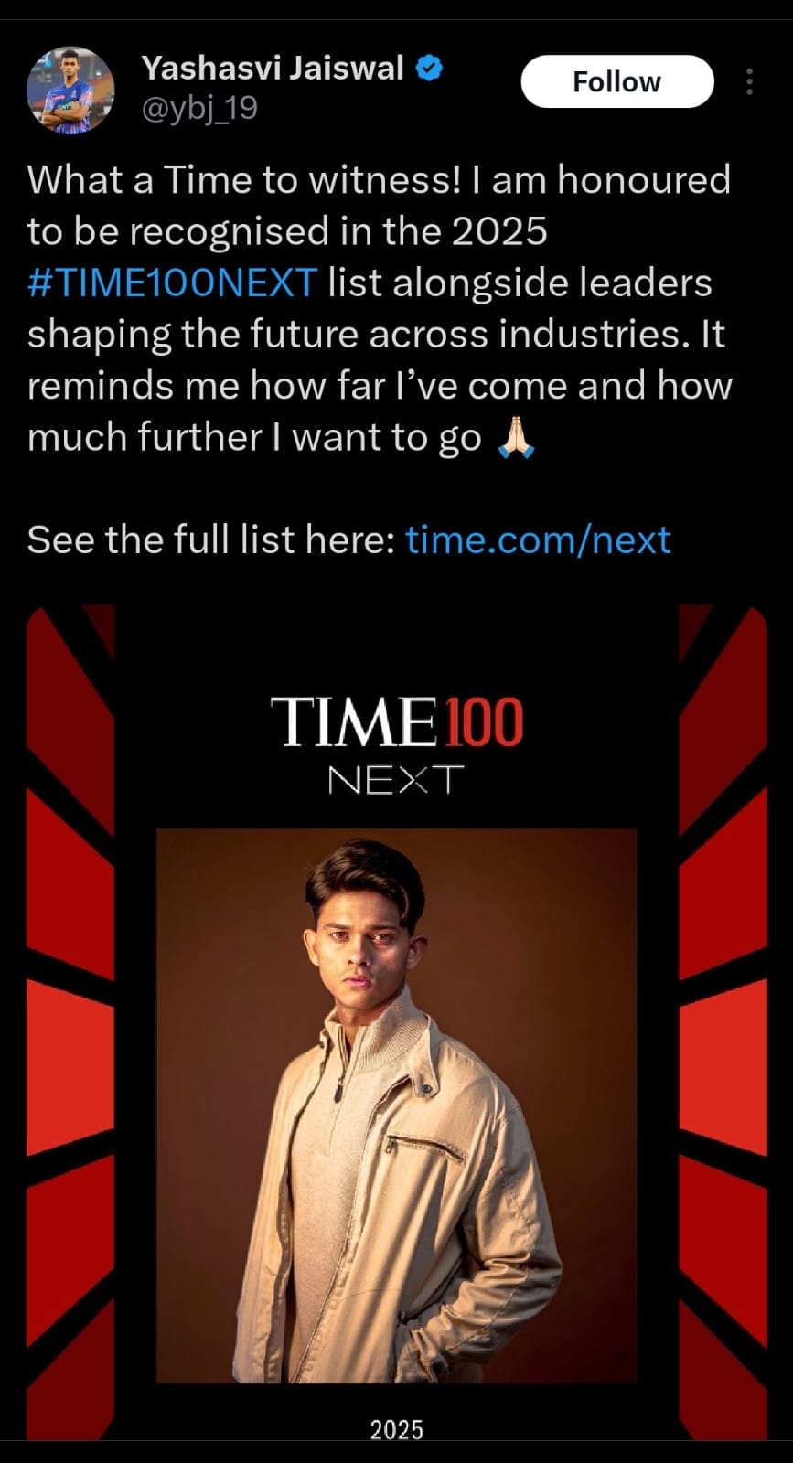 Time magazine has included Indian opener Yashasvi Jaiswal in the list of 100 emerging stars of the world. Jaiswal is the only cricketer involved in 2025 Time 100 Next. He posted on the social media platform and informed about it.